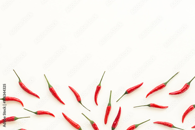 red hot chili peppers, popular spices concept - beautiful handful of red hot pepper pods scattered on white background, top view, flat lay, empty space for the text