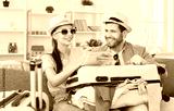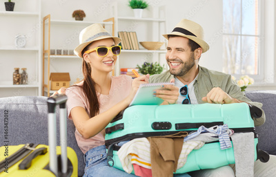 Happy cheerful couple in beach hats sitting on sofa at home with packed suitcase making a shopping list for vacation. Man and woman going on holiday trip. Summer journey and travelling concept.