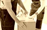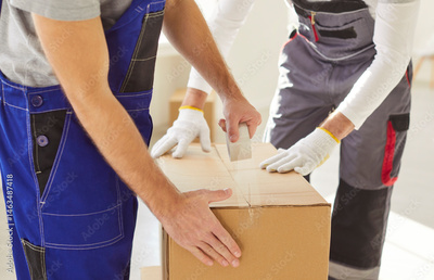 Delivery service men pack using scotch box lock packaging tape, shipping specialists transporting cardboard boxes, movers service unloading and removing things for moving company working, helping