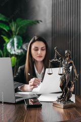 A lawyer or attorney reviews client files, interview transcripts, evidence with a laptop computer in a modern office. Concepts of law and legal services.