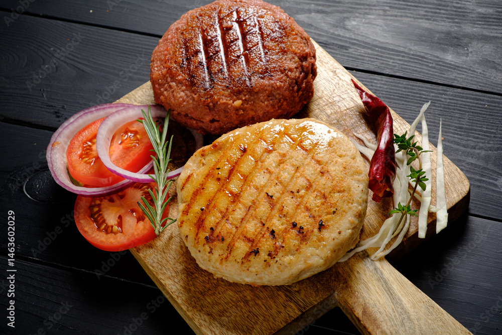 Two savory patties alongside fresh slices of tomato and onion create a vibrant meal