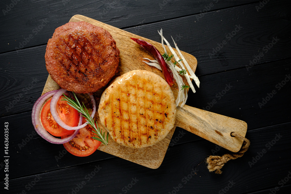 Enjoy grilled burger patties with fresh tomatoes and onions on a wooden board