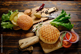 Grilled burger patties await fresh lettuce, onions, and tomatoes for assembly