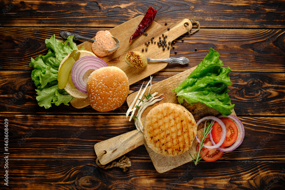 Fresh vegetables and condiments lie on wooden boards, ready for crafting flavorful gourmet burgers