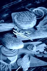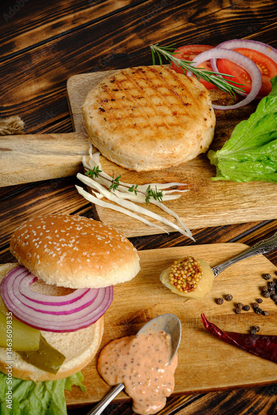 Freshly grilled vegetarian patty sits atop a burger bun, surrounded by vibrant toppings and sauces