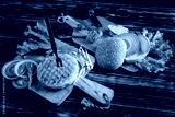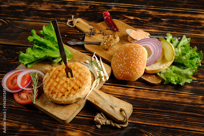 Gourmet burger being assembled with fresh vegetables and tantalizing condiments on wooden boards