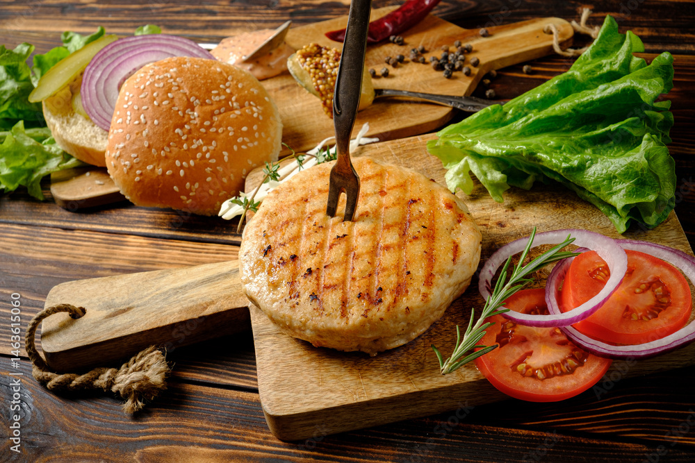 Fresh veggies and a grilled burger patty await assembly in a tasty culinary delight
