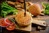 Freshly grilled chicken patty awaits toppings, alongside vibrant veggies and aromatic herbs