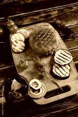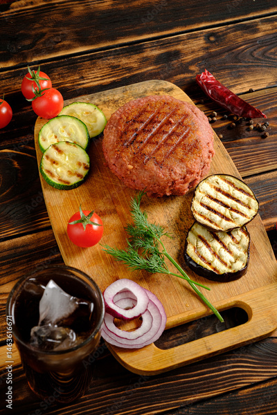 A tasty veggie burger with grilled tomatoes, zucchini, and eggplant on a wooden board