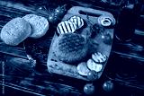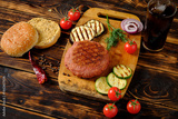 Juicy grilled burger patty alongside fresh vegetables and drinks on a wooden cutting board