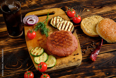 A mouthwatering burger sits on a wooden board, surrounded by fresh ingredients and a cold beverage