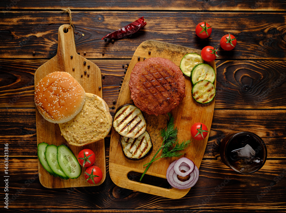 Mouthwatering grilled veggie burger with fresh vegetables and a sesame bun awaits a hungry diner