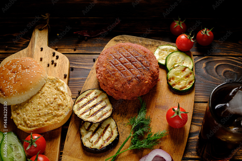 A savory burger is crafted with grilled vegetables and fresh ingredients, bursting with color
