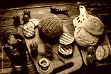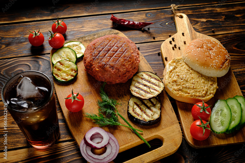 Savory grilled burger with vegetables and drinks elegantly arranged on a rustic wooden board