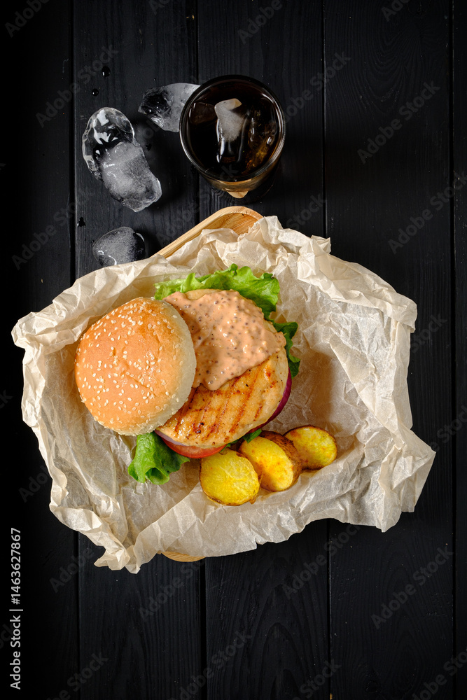 Enjoying a grilled chicken sandwich, crispy wedges, and a drink in a cozy spot