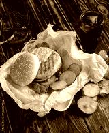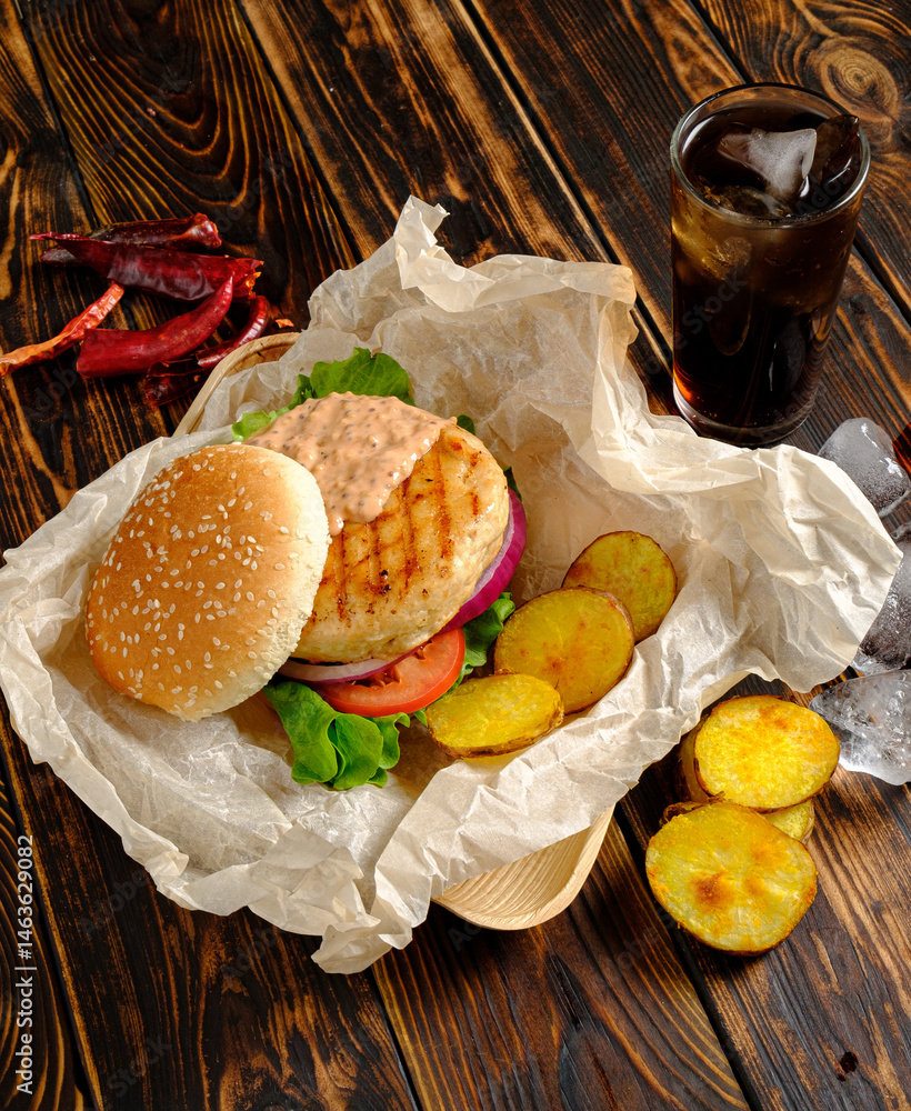 Juicy burger with fresh veggies, golden fries, and a refreshing drink