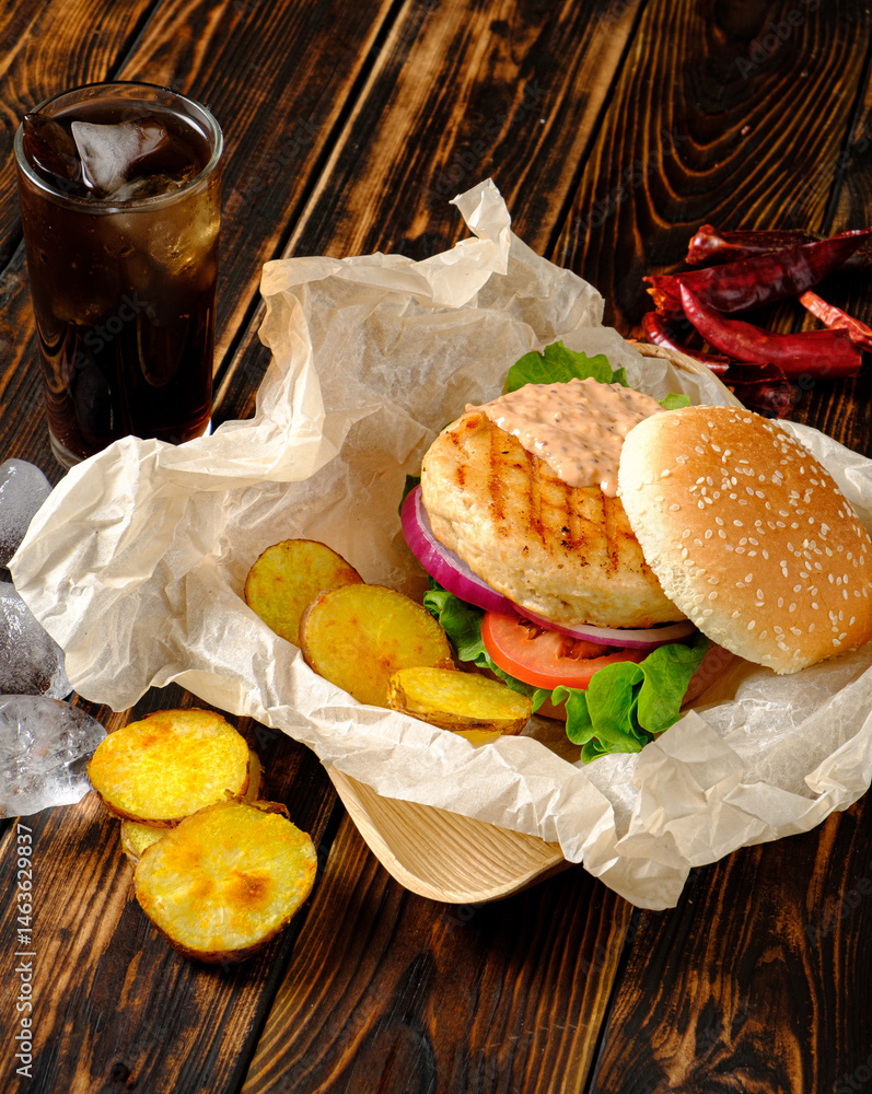 Savor a tasty grilled burger with fresh lettuce, tomato, and crispy potato slices