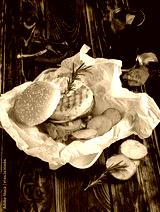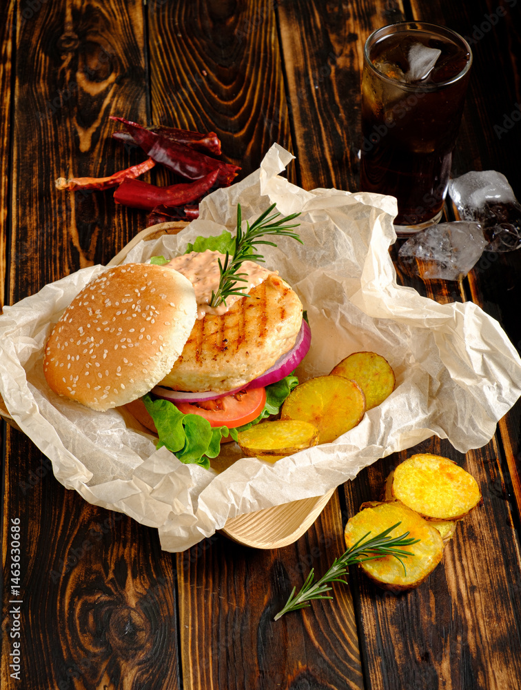 A delicious grilled burger sits atop fresh vegetables next to crispy potato slices and a drink