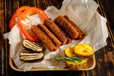 Tasty skewers served with roasted eggplant and sweet potato, bursting with color and texture