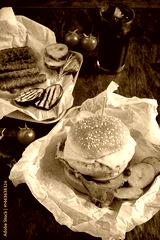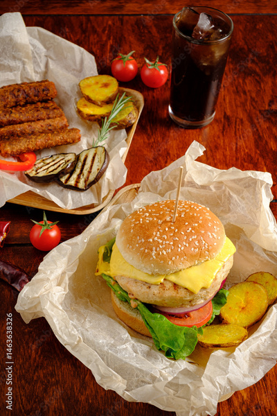 A tasty burger with lettuce, cheese, and tomato is served with crispy plantains and sausages