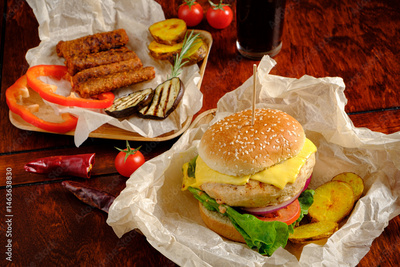 A delicious burger topped with cheese and fresh veggies rests beside grilled sides and tomatoes