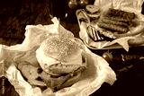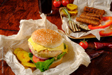 Delicious burger featuring fresh ingredients and sides, perfect for a hearty meal in a cozy setting