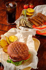 Savoring a gourmet burger alongside grilled vegetables and a cold beverage in a warm setting