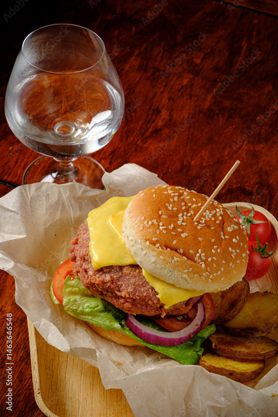 Savoring a delicious cheeseburger topped with lettuce, tomato, onion, and served with fries