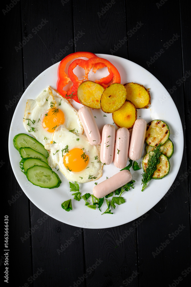 Savory sunny-side up eggs with fresh veggies and grilled sausages make the perfect breakfast
