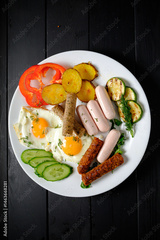 A delicious breakfast of sunny-side-up eggs, sausages, and colorful veggies