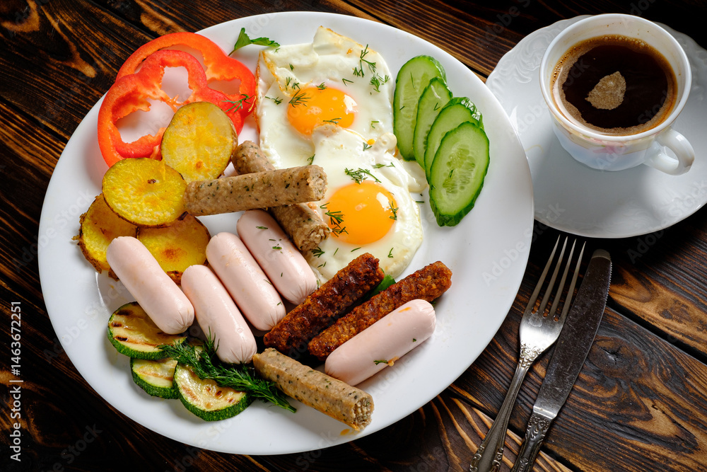 A hearty breakfast spread with perfectly cooked eggs, various sausages, and vibrant vegetables