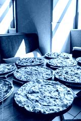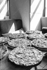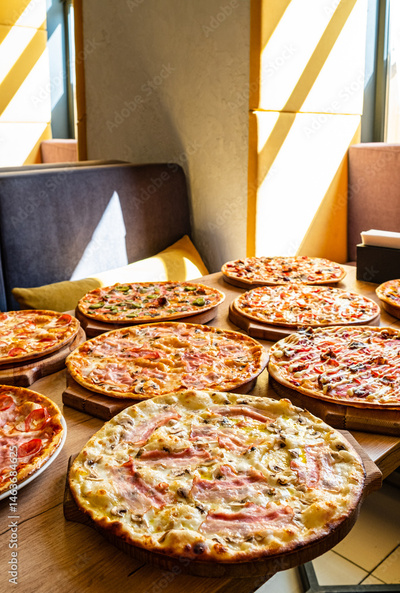 Delicious pizzas with vibrant toppings sit on a wooden table in a cozy café