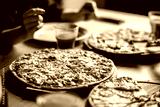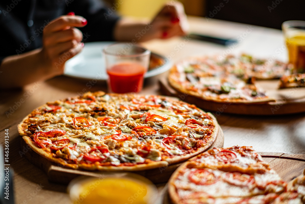 Friends gather around a table savoring delicious pizzas topped with fresh ingredients and sauces