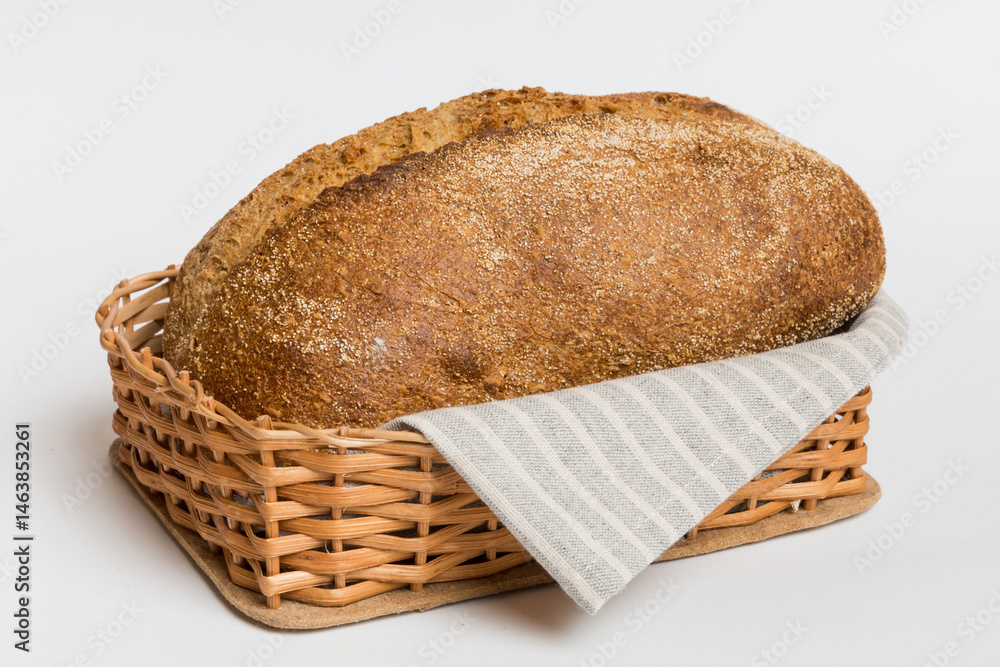 Freshly baked bread on basket against natural background. Perspective view bread copy space