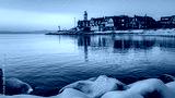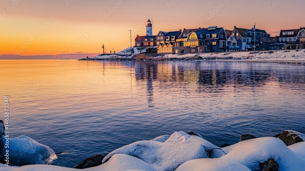 A peaceful winter evening in the charming town of Urk, Netherlands, showcases colorful buildings along the shoreline. Soft pastel hues reflect on the calm waters as the sun sets by the lighthouse