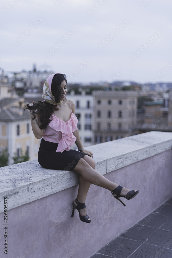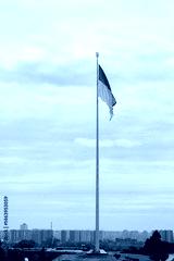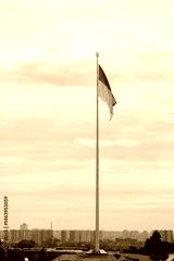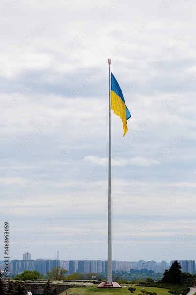 National flag of Ukraine against blue sky. The largest flag is installed in Kyiv