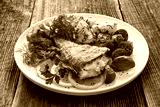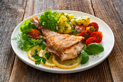 Fried atlantic redfish with boiled potatoes and tomato salad on wooden table