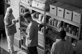Group of volunteers in food pantry organizing and taking inventory of donated goods. Shelves stacked with various food items and supplies in background