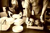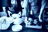 Restaurant staff preparing food orders with hands seen organizing takeaway boxes and serving freshly baked bread on a tray in the kitchen. Workers wearing aprons and gloves
