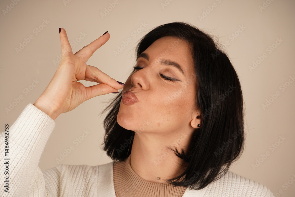 Beautiful female gestures showing the real taste of Italian pasta, has never eaten anything more delicious, wearing casual jeans, white sweater, isolated on beige background. Great