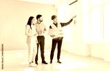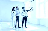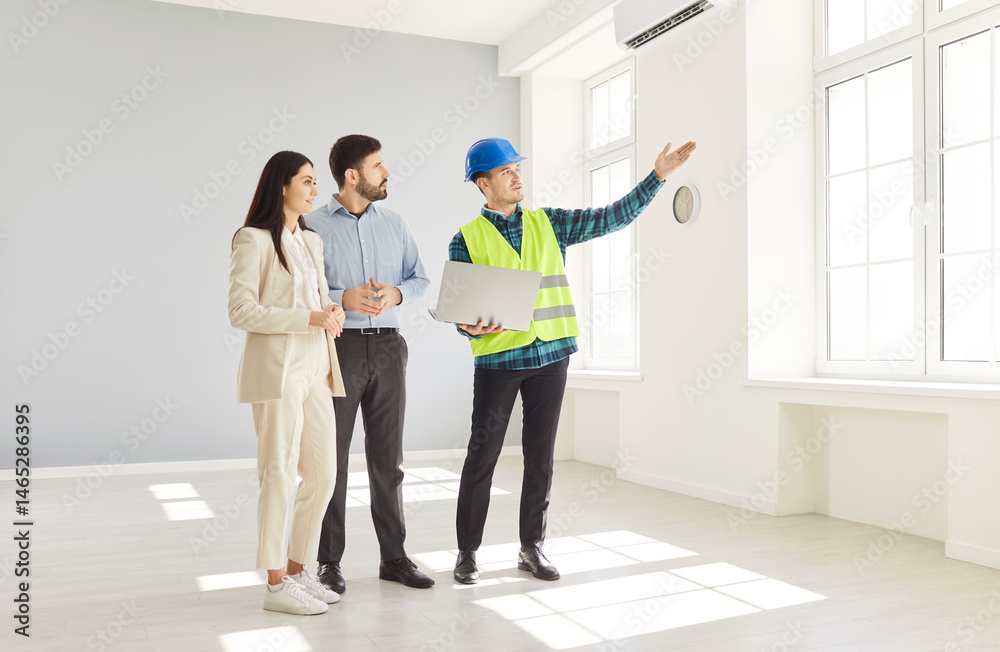 Professional foreman worker and family clients supervise and direct, meeting looking at project plan, holding blueprints, planning work, discussion with construction engineer in hardhat, design ideas