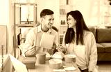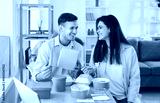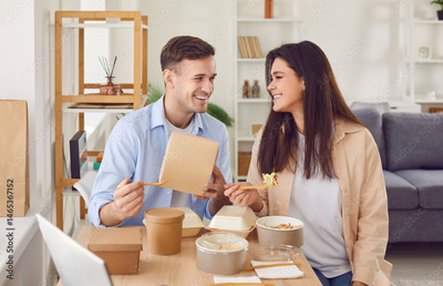 Young man and woman sitting with cardboard boxes eating fresh healthy food delivered from online order on laptop. Married couple having lunch at home sitting at table. Food delivery service concept.