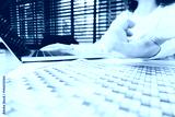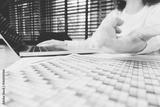 woman hand working with phone and laptop on wooden desk in office. can be used on an ad