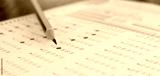 Standardized test exams form with answers bubbled in and color pencil resting on the paper test, education concept