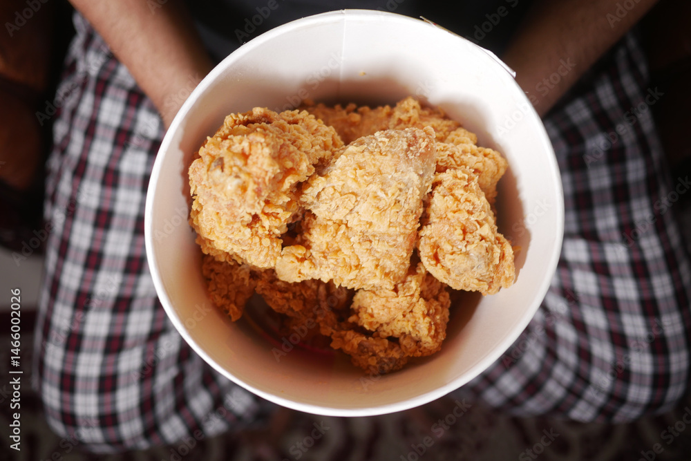 Friends enjoy a bucket of crispy fried chicken at a relaxed gathering