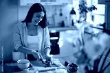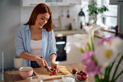Happy woman cutting strawberries while preparing healthy meal in morning.