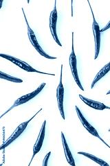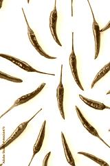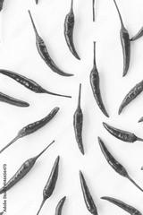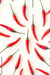 food pattern, popular spices concept - closeup beautiful red hot chili peppers filled white background, green tails, collage of freely lying peppers, top view, flat lay