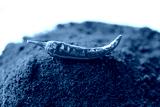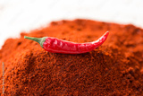chili red hot pepper, concept of popular spice - delicious juicy pod of chili red pepper is isolated on top of red curry powder, ground dried idnian famous blend