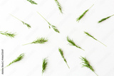 white background filled with Ears of a green cereal pattern. Top view. Flat lay. Concept of healthy lifestile, organic food, freshness and spring mood. minimalistic picture of the ripening harvest.