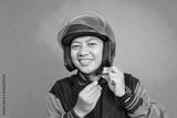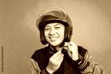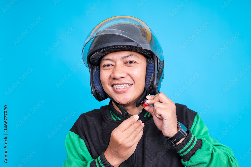 Portrait of Asian Online Taxi Driver in Green Jacket Wearing Helmet Before Riding a Bike